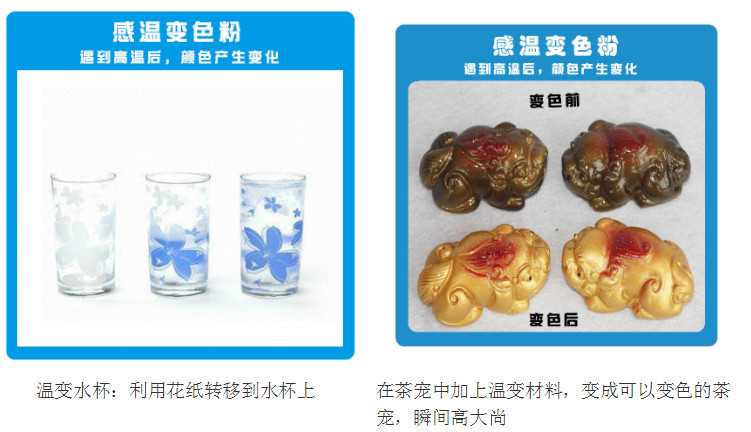 目前大多產(chǎn)品已經(jīng)讓消費者產(chǎn)生了審美疲勞;沒有足夠的新品來吸引消費者;而溫變粉變色顏料則足夠給您產(chǎn)品帶來新穎;如圖上的變色杯子、變色茶寵、變色貼紙等;現(xiàn)在的產(chǎn)品都是大同小異;但加上變色材料后,瞬間可以秒殺其他同款休閑包,這就是變色的魅力。買溫變粉就到廣州頂凡溫變粉生產(chǎn)廠家。電話:13378693789、020-29862888 周先生